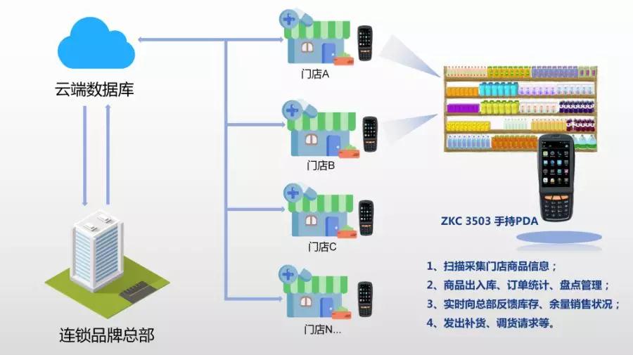 通過ZKC3503手持PDA移動智能終端設(shè)備來實(shí)現(xiàn)對連鎖門店的低成本信息化、透明化管理。ZKC3503高速的數(shù)據(jù)處理、傳輸能力、便捷的操作體驗(yàn),成功搭建門店與品牌總部之間實(shí)時互通的數(shù)據(jù)傳輸渠道,增加品牌與消費(fèi)者之間的互動。在提升管理效率的同時,打造良好的連鎖品牌形象,吸引更多消費(fèi)者。