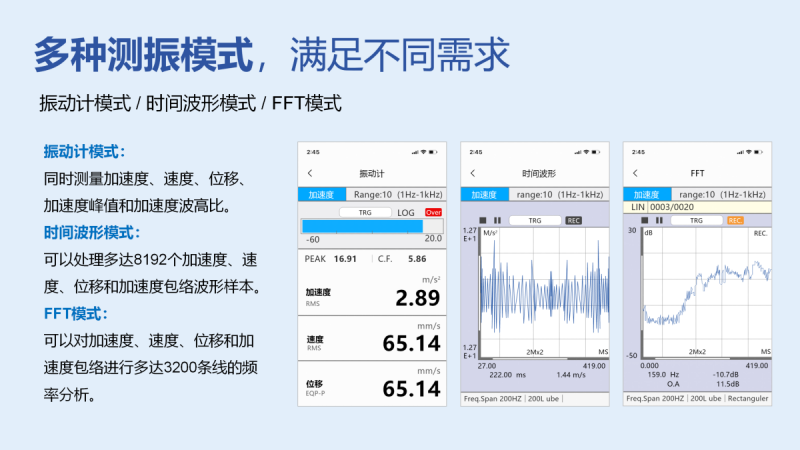 通過(guò)測(cè)量振動(dòng)速度、加速度和位移,它能有效判斷出設(shè)備是否存在不平衡、不對(duì)中、軸承磨損、齒輪故障等潛在問(wèn)題。其三種測(cè)振模式,可滿足不同深度的分析需求: