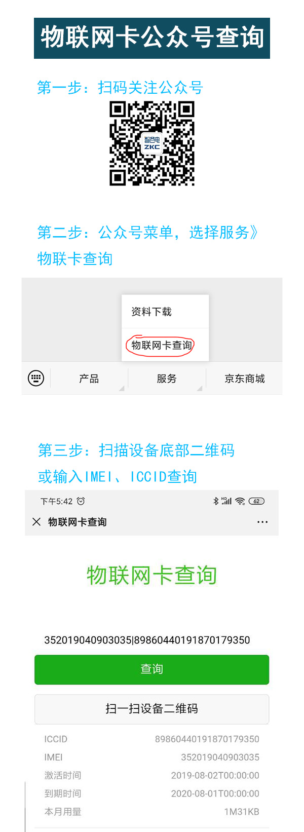 隨著物聯(lián)網(wǎng)卡在移動(dòng)傳媒、監(jiān)控和監(jiān)測(cè)、醫(yī)療健康、車(chē)聯(lián)網(wǎng)、可穿戴設(shè)備、智能設(shè)備、無(wú)線POS機(jī)等諸多領(lǐng)域的廣泛應(yīng)用,用戶數(shù)量逐漸增長(zhǎng)。為了方便物聯(lián)網(wǎng)卡用戶快速獲取物聯(lián)網(wǎng)卡ICCID、設(shè)備IMEI號(hào)碼,智谷聯(lián)官方微信公眾號(hào)提供物聯(lián)網(wǎng)在線查詢(xún)服務(wù),包括查詢(xún)ICCID、IMEI、激活時(shí)間、到期時(shí)間、本月用量等。具體操作步驟如下: