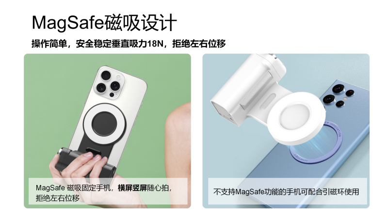 這款助拍手柄采用MagSafe磁吸設(shè)計(jì),擁有垂直吸力18N的強(qiáng)勁磁力,徹底告別左右位移的尷尬。無(wú)論是橫屏拍攝風(fēng)景,還是豎屏錄制vlog,手機(jī)都能牢牢固定,讓你專注于創(chuàng)作本身。