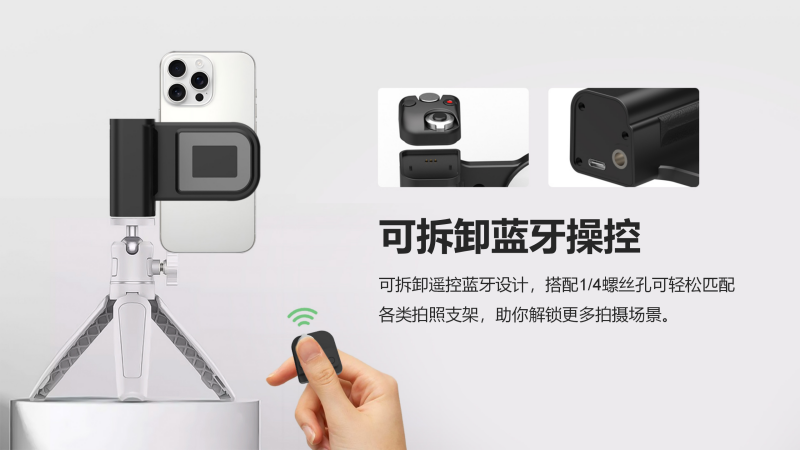 這款助拍手柄的可拆卸藍(lán)牙遙控器搭配1/4螺絲孔,可以輕松匹配各類拍照支架,無(wú)論是自拍、直播還是專業(yè)拍攝,都能完美適配。想象一下,在旅行中拍攝延時(shí)攝影,或者在家中直播帶貨,它都能成為你的得力助手。