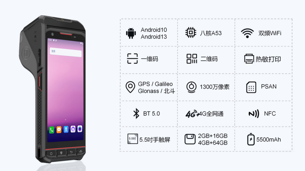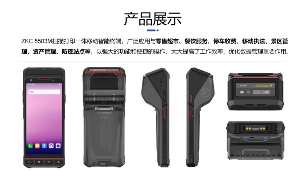• 產(chǎn)品描述:ZKC 5503M掃描打印移動(dòng)智能終端,基于Andriod 13操作系統(tǒng), 采用八核處理器,集成條碼掃描、熱敏打印、1300W攝像頭拍照錄像、NFC讀寫等功能,廣泛應(yīng)用與零售超市、餐飲服務(wù)、停車收費(fèi)、移動(dòng)執(zhí)法、景區(qū)管理、資產(chǎn)管理、防疫站點(diǎn)等,以強(qiáng)大的功能和便捷的操作,大大提高了工作效率、優(yōu)化數(shù)據(jù)管理重要作用