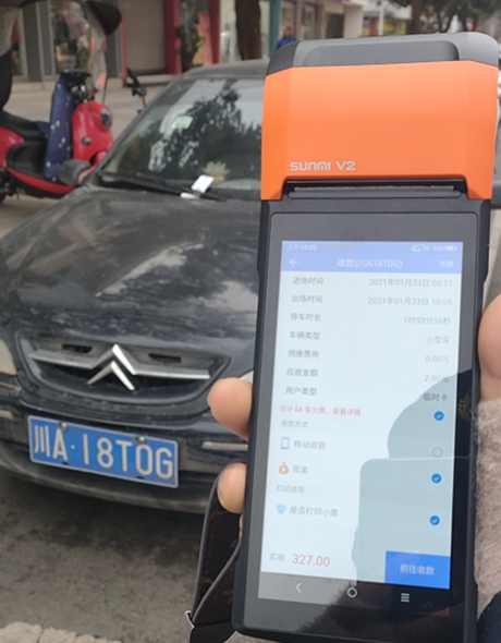 2.登記打票:巡檢員通過手持機(jī)識(shí)別車牌操作車輛入場(chǎng),并打印停車小票置于車上,供車主掃碼支付